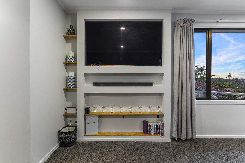 • A built-in TV wall with floating shelves